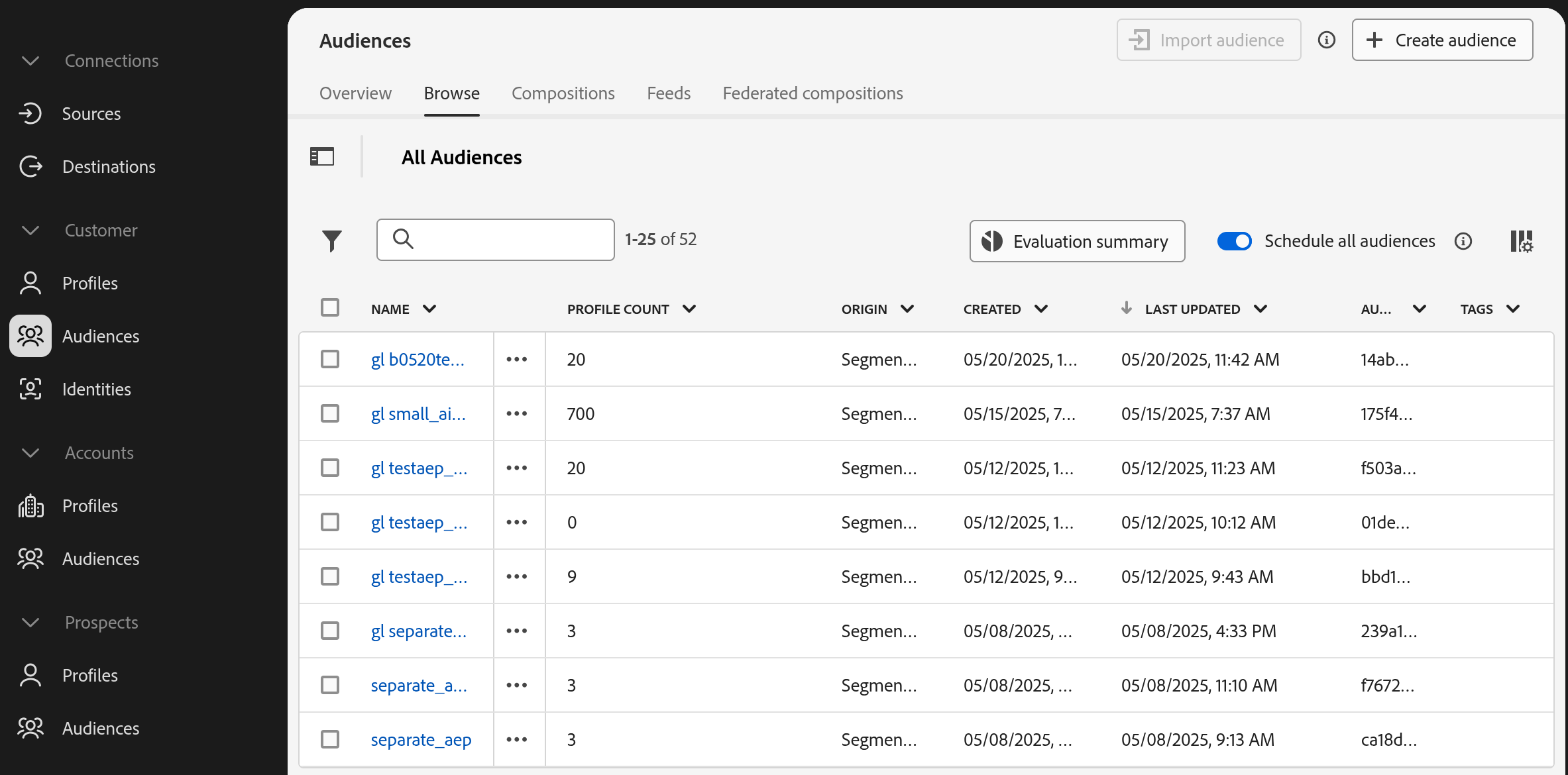 To view your audience, log in to Adobe Experience Platform and navigate to the Audiences page under the Customers section in the left-hand navigation. There, you’ll find your audience listed with the prefix gl_."