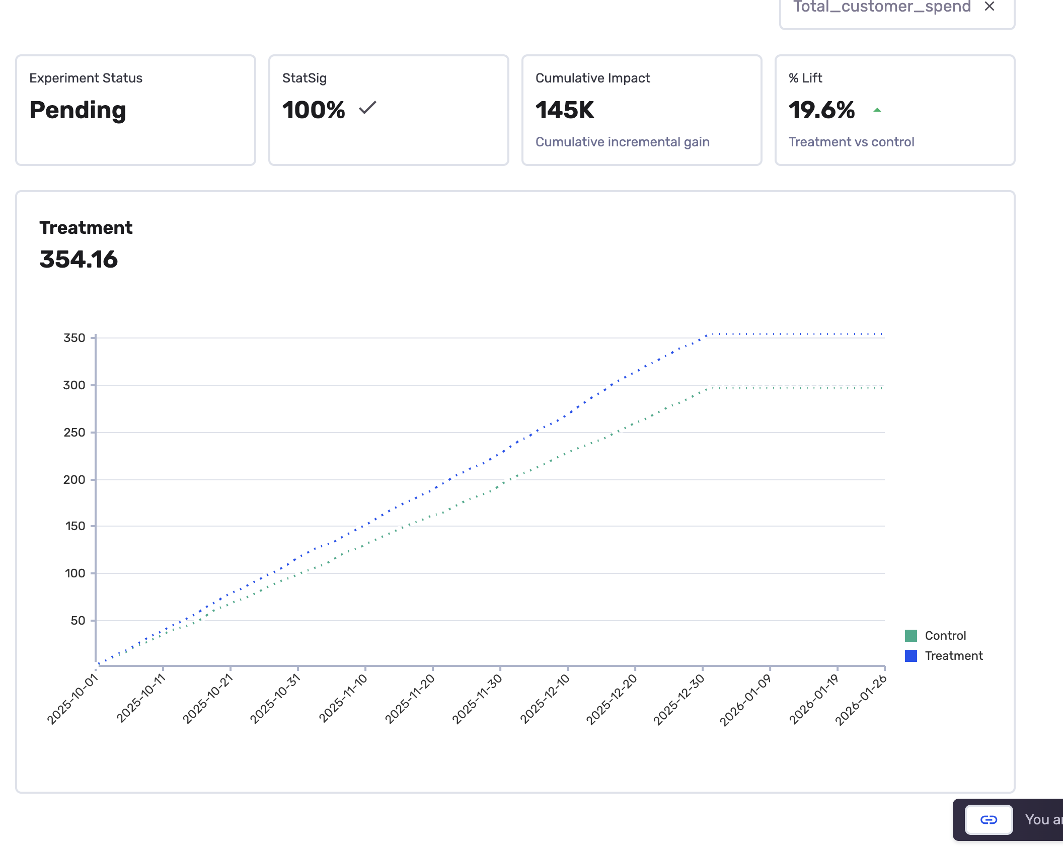 - Check results after two weeks. Your dashboard shows the treatment group is spending about 25% more than the control group, with StatSig reached 100%