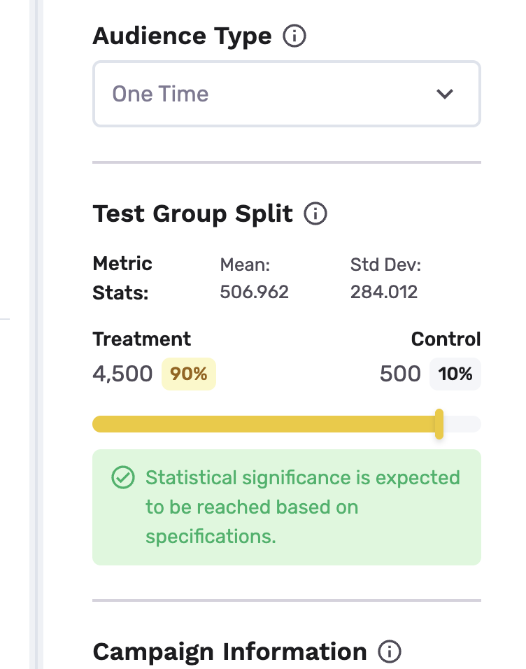 - For one-time audiences, treatment/control split automatically defaults to the most efficient split that keeps the control group the smallest while still being expected to reach StatSig (statistical significance) based on advanced forecasting over experimentation settings