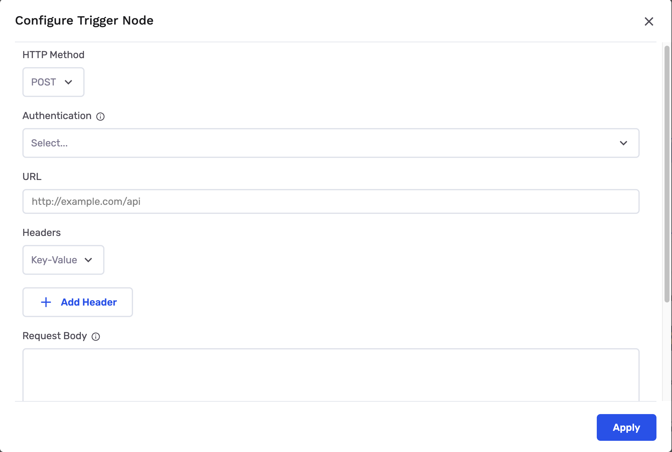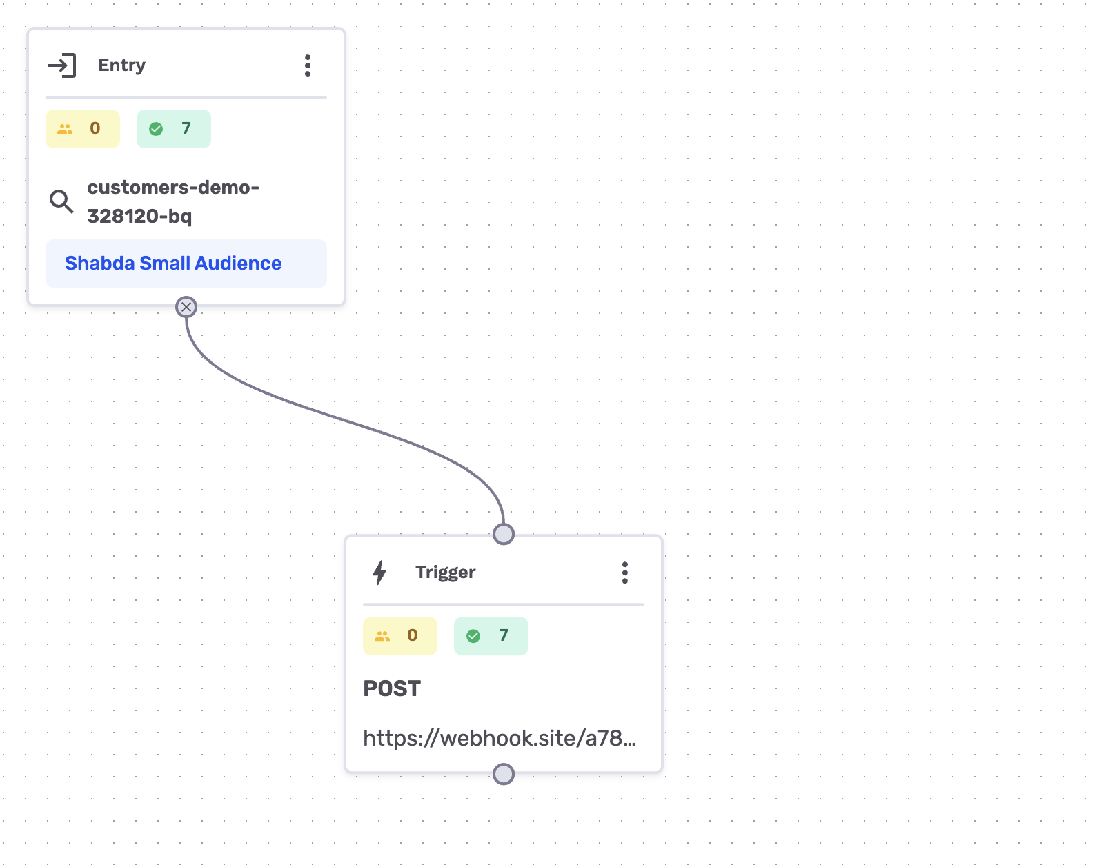 A trigger node fires an HTTP request to an external endpoint when users enter it. This is useful for integrating with external systems, triggering webhooks, or calling custom APIs as part of your journey flow.