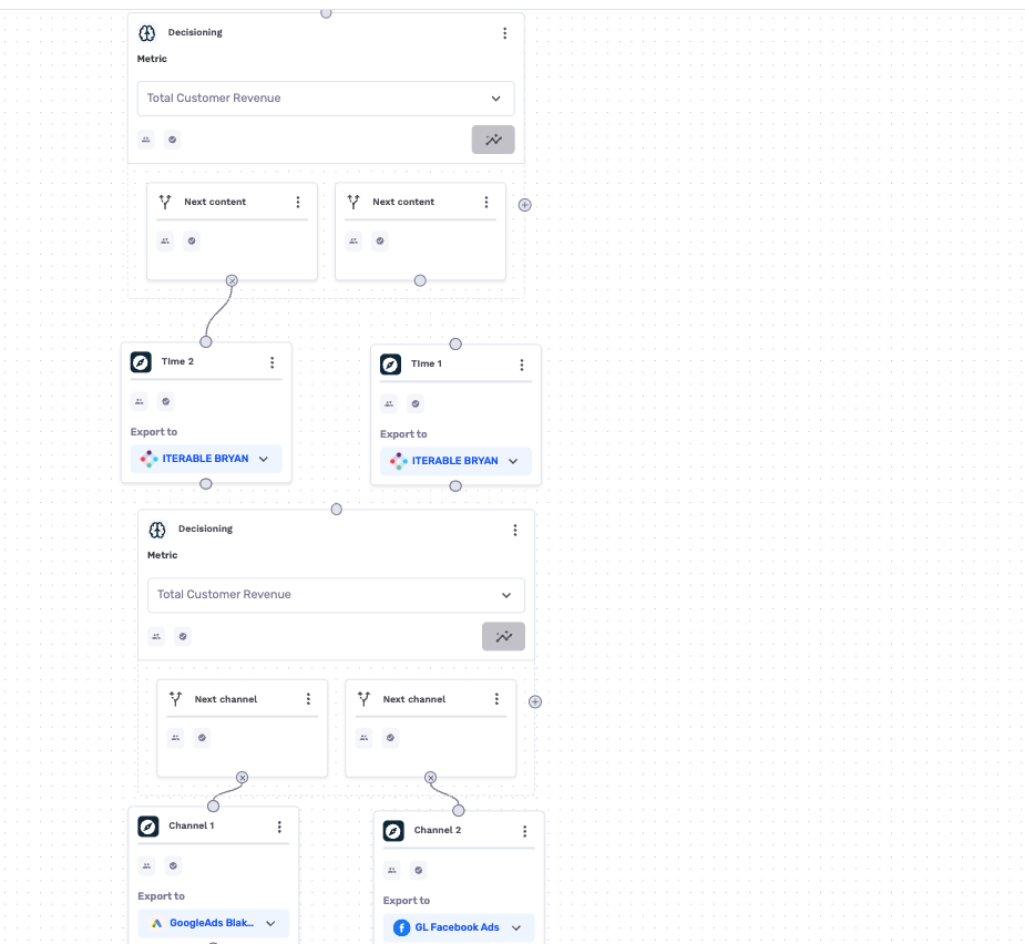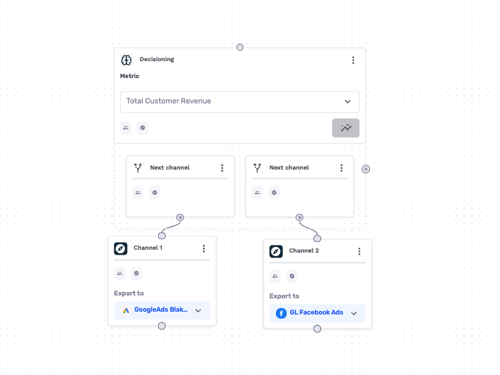 - Use multiple Decisioning nodes when your journey involves several independent decision points (e.g., which channel to use and which offer to show). Each node optimizes its own decision independently.