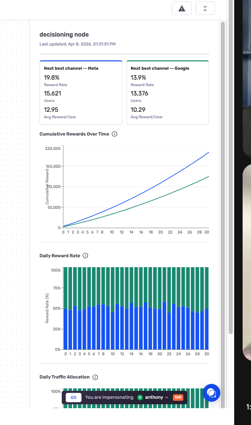 Unlike a standard Experiment node, which uses a fixed percentage or count split, the Decisioning node uses dynamic allocation that adapts as data comes in. You get the benefits of experimentation with the efficiency of real-time optimization.