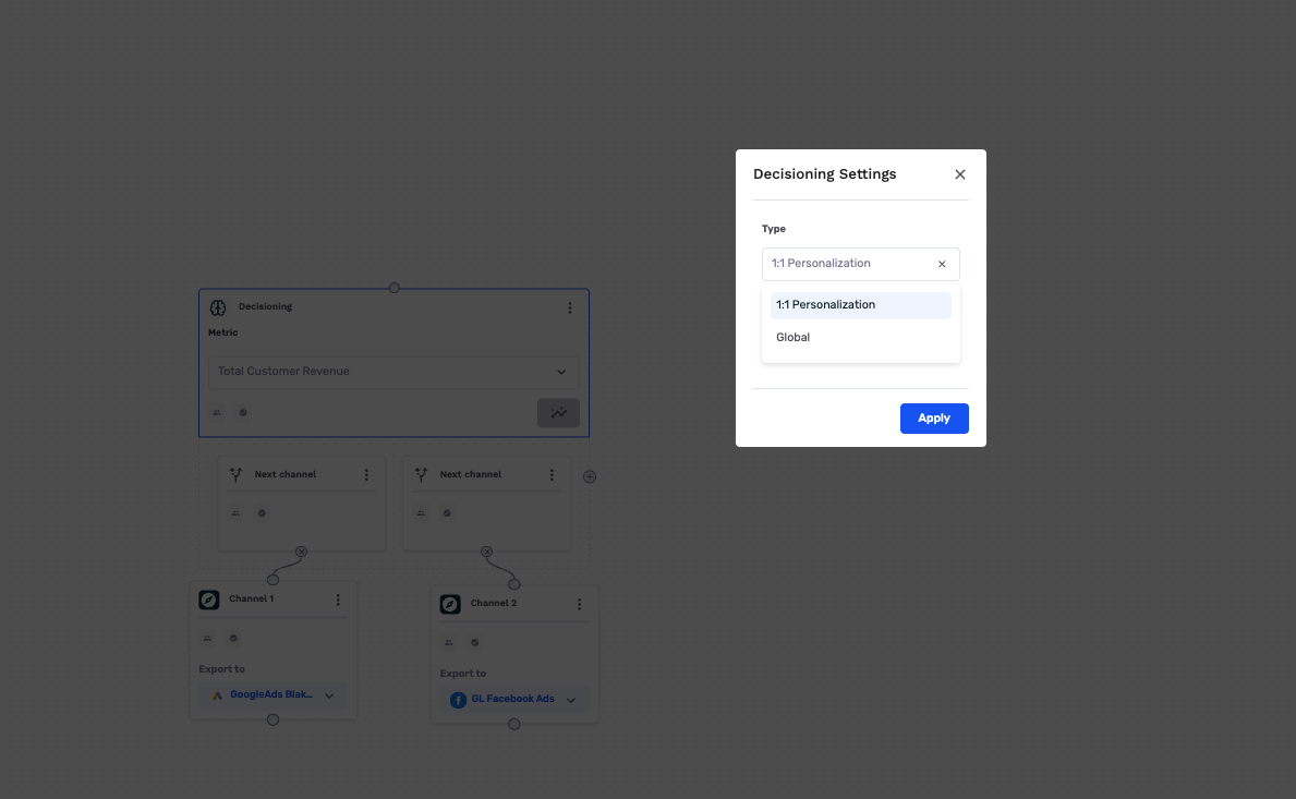 | Decisioning type | Controls how the algorithm learns -- either personalized to each customer's characteristics (1:1 Personalization) or optimized globally across all customers (Global). |