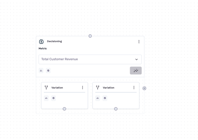 A Decisioning node is a special node type on the journey canvas that contains multiple variation paths (arms). When customers reach the decisioning node, GrowthLoop assigns them to a variation and tracks the downstream outcome using the metric you selected. Over time, the algorithm learns which variation -- and which customer characteristics -- drive the best results, and it shifts traffic allocation toward the winning paths.