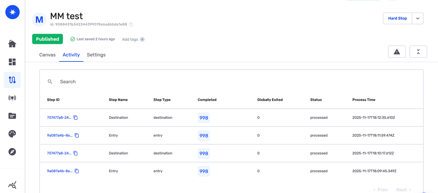 The Journey Activity Tracker helps you dive deeper and understand when, how, and the result of every step that is processed in your journey. This is the fastest way to debug your journeys and ensure they are operating exactly as you expect.